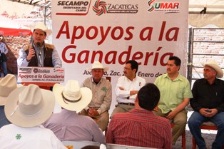 Alonso Reyes reiteró su compromiso para trabajar a favor del agro zacatecano, pues tan sólo en 2012 se invirtieron 500 millones de pesos en apoyo a la ganadería de la entidad, de los cuales 220 millones se utilizaron en la producción de forrajes, 95 en la adquisición de implementos forrajeros y la construcción de bordos de abrevadero, así como 18 millones en apoyos para la adquisición de sementales bovinos.
