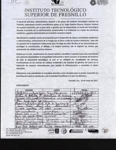 La mayoría de los trabajadores del Instituto Tecnológico Superior de Fresnillo, mostraron esta mañana su total apoyo al licenciado Hugo Jiménez Álvarez, y rechazaron tajantemente las acciones de algunos de sus compañeros que mantienen una huelga en dicho plantel.