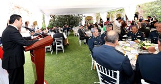 Zacatecas, Zac.- Luego de acudir al homenaje que los tres poderes de Gobierno realizaran a las fuerzas armadas en la Legislatura local, el Gobernador Miguel Alonso Reyes ofreció una comida en honor al General Salvador Cienfuegos Zepeda, secretario de la Defensa Nacional. El mandatario estatal valoró al funcionario federal el apoyo y respaldo recibido para el estado, con el que hace una extraordinaria labor de coordinación y comunicación. Además, Alonso Reyes entregó un reconocimiento al Secretario como visitante distinguido, en el marco de los Cien años del Ejército Mexicano, confiriéndole el facsímil del escudo de armas de la Muy Noble y Leal Ciudad de Nuestra Señora de Zacatecas, como símbolo de gratitud por su visita. Por su parte, el General Cienfuegos Zepeda agradeció la deferencia que Zacatecas hizo al Ejército, ya que es de enorme significancia para quienes tienen el honor de ser soldados.