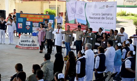 Fresnillo, Zac.- El Presidente Municipal, Benjamín Medrano, encabezó el acto de inauguración, en la escuela Francisco Goitia, de la Tercera Semana Nacional de Salud, con la que se pretende aplicar 45 mil dosis de vacunas en Fresnillo.