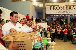 Con la presencia de 21 delegados federales y 10 secretarios y directores de Gobierno del Estado, Alonso Reyes entregó 200 paquetes de aves de traspatio, microcréditos, material didáctico y deportivo, tarjetas Liconsa, 1 mil 150 apoyos por frentes fríos, cheques para madres solteras y del Programa de Restauración Contemporánea.