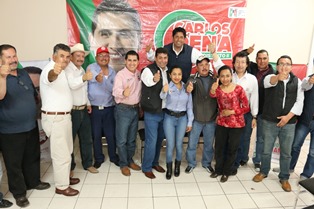 Calera, Zac.- Al continuar con su intensa gira por los municipios que conforman el Distrito II, en busca del voto ciudadano, Carlos Peña, abanderado de la Alianza PRI-Verde, recibió el respaldo de grupos ciudadanos y priístas encabezados por Ernesto Arellano, quien es candidato suplente a la alcaldía de Calera.