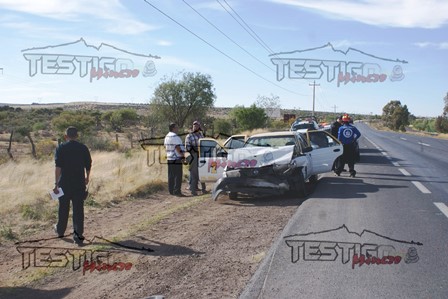 Siendo las 17:30 horas sobre recorrido de vigilancia con personal paramédico a bordo se recibe reporte del Sistema de Emergencias 066, que en la carretera federal 45 como referencia mencionaba que frente al racho el álamo se había suscitado un accidente tipo choque, en el que se encontraban personas lesionadas, acudiendo al reporte, al arribar al lugar ya se encontraba la ambulancia número 03 de Bomberos en esta tenían 5 personas lesionadas en código amarillo, de nombres María Guadalupe Sánchez de 36 años de edad, Roxana Guadalupe Sánchez de 8 años de edad, Alondra Tonai Sánchez de 16 años de edad, María Fernanda Sánchez Muñoz de 17 años de edad y Maricela Veloz Rodríguez de 46 años de edad, fueron trasladadas al hospital General fresnillo, el chofer de la ambulancia nos cometa que al lugar también arribo la unidad 517 a cargo de Manuel Leiva misma que traslado 3 lesionados de los cuales desconocemos datos, todos ellos viajaban en un taxi de sitio Ojuelos, siendo un Nissan Tsuru color blanco, con número económico 02, placas del estado de zacatecas 90222fb y número de serie 3n1eb3154ck332668, el cual se impactó con un vehículo Nissan Tsuru color rojo, con placas del estado de zacatecas zha5926 y número de serie uh1b31p7pu233067, era conducido por Federico Loera Macías de 45 años de edad, al lugar arriba Policía Federal, haciéndose cargo del lugar.