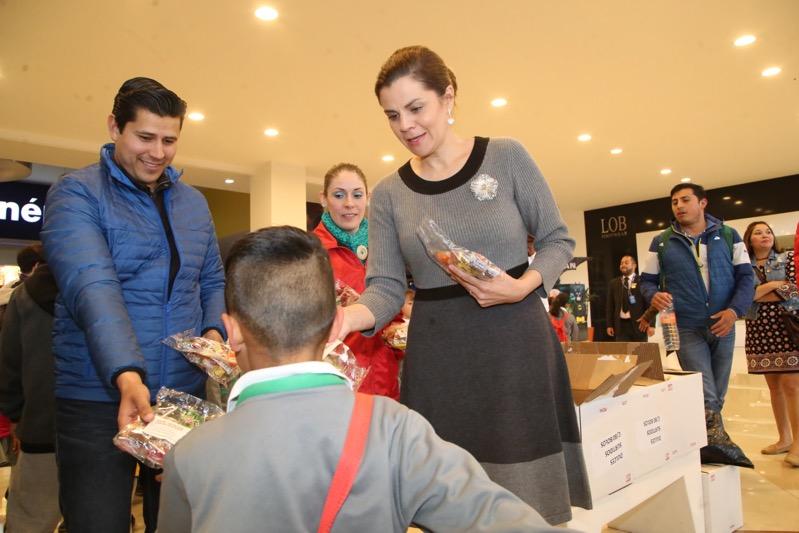 Cristina Rodríguez de Tello, presidenta honorífica del DIF Estatal, recibió a las y los pequeños con una bolsa de dulces previo a la proyección del filme y les invitó a conducirse de la mejor manera con sus padres y sus maestros.