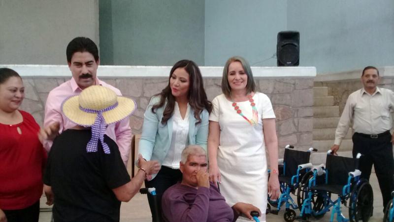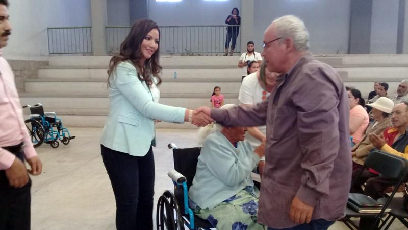 A nombre de la Presidenta Honorífica del SEDIF, Cristina Rodríguez de Tello, la Subdirectora de Gestión y Atención Ciudadana, Lourdes de la Rosa, entregó 20 sillas de ruedas, acompañada por la diputada federal Claudia Anaya, el alcalde Gerardo Cabral y la presidenta honorifica del DIF Municipal, Otilia Guzmán.