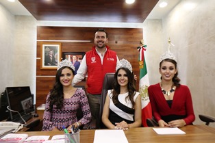 El Presidente Municipal, José Haro de la Torre, le da la bienvenida a ella y las princesas, Neyla y Fernanda. • La soberana de Fresnillo entrega despensas, útiles escolares, cobijas, calentadores solares, entre otras cosas. Fresnillo, Zac.- Como toda una tradición, Fernanda Argomaniz, reina de la Feria Nacional de Fresnillo (Fenafllo) 2017, desempeñó el papel de “Alcaldesa por un día” y fue recibida por el Alcalde, José Haro de la Torre en su oficina de Presidencia Municipal. Acompañada por sus princesas, Neyla y Mayela, Su Graciosa Majestad (SGM) entró al Palacio Municipal junto a las autoridades municipales, quienes les dieron la más cordial bienvenida y el agradecimiento por estar presente en este simbólico evento que por varios años se ha realizado en el Real de Minas de Fresnillo para que las personas se acerquen a ella, la conozcan y se lleven un apoyo pensando en su bienestar social. “Es un gusto recibirlas en este Ayuntamiento, siéntanse muy contentas de dar la bienvenida a tantas personas que con gusto han arribado a este lugar con el objetivo de obtener un apoyo por parte de ustedes, y a nombre de los funcionarios y los mil 700 trabajadores que laboran aquí trabajando por la grandeza de Fresnillo, les expreso una extensa felicitación por el trabajo que han realizado representando a los fresnillenses”, puntualizó Haro de la Torre. Posteriormente acompañó a la corte real a tomar lugar en su oficina de trabajo y comenzar con la entrega de más de 500 apoyos como despensas, cobijas, paquetes de útiles escolares, cisternas, calentadores solares y materiales de mejoramiento a la vivienda. En esta memorable actividad también se contó con la presencia de Alejandro González Cosío, Contralor Municipal y Marcela del Cojo Gómez, Oficial Mayor del Honorable Ayuntamiento