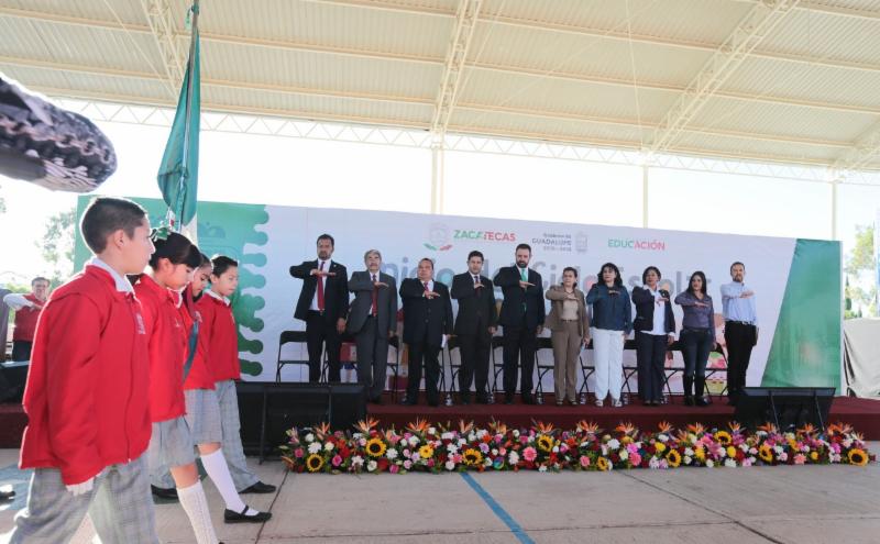 Guadalupe, Zac.- Con la entrega de 380 mil apoyos escolares (mochilas, útiles y chamarras), el anuncio de 150 millones de pesos en becas para que ninguna niña, niño o joven zacatecano se quede fuera de las aulas y la puesta en marcha del Programa Mejorando tu Escuela, el Gobernador Alejandro Tello dio inicio al ciclo escolar 2017-2018 para 375 mil alumnas y alumnos de educación básica repartidos en más de 4 mil escuelas.
