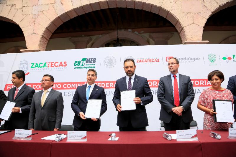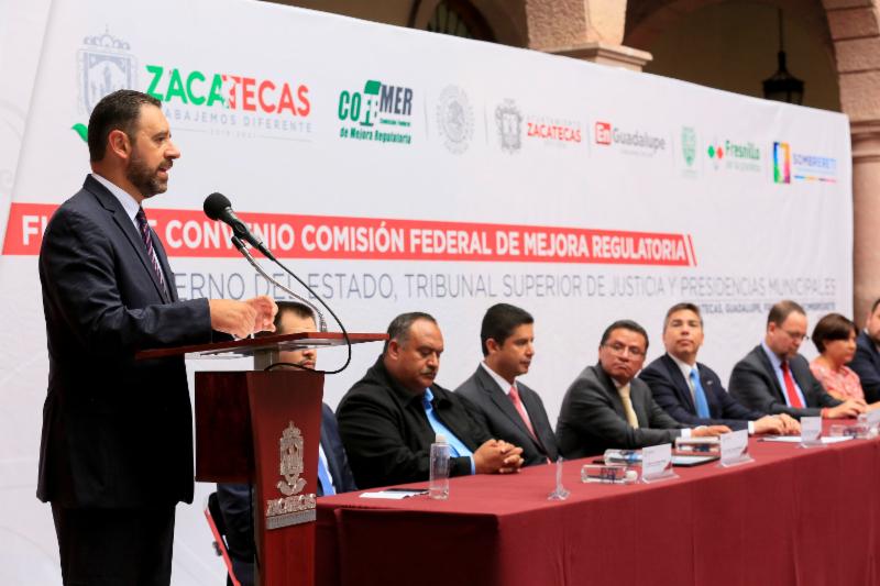 El mandatario destacó que además el convenio firmado entre la Cofemer y el Tribunal Superior de Justicia de Estado de Zacatecas permitirá analizar el marco regulatorio local para identificar las barreras que detienen el desarrollo económico en sectores clave y así implementar reformas a los instrumentos jurídicos aplicables.