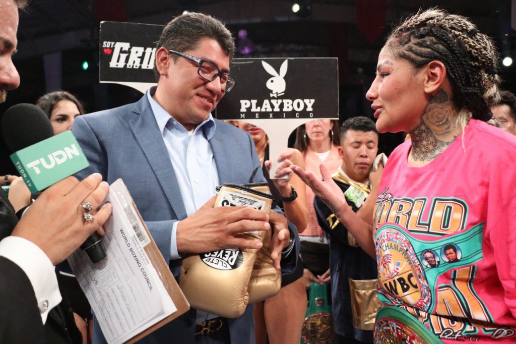 El Presidente Municipal, Saúl Monreal Ávila, levantó la mano de la campeona mundial entre el aplauso de los más de 3 mil 500 asistentes, mientras que “La Barby» en señal de agradecimiento le regaló sus guantes.