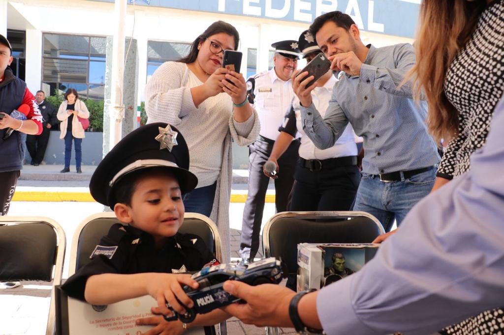 Monreal Ávila le entregó una patrulla de juguete que simboliza los recorridos que realizan los oficiales todos los días para cuidar los mil 340 kilómetros de la jurisdicción perteneciente a la Policía Federal.
