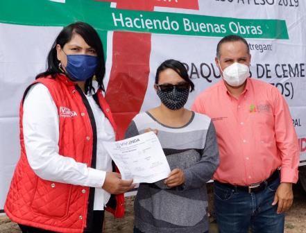 Durante la entrega, la Secretaria de Desarrollo Urbano, Vivienda y Ordenamiento Territorial, María Guadalupe López Marchán, informó que, a través del Programa de Mejoramiento de Vivienda Peso a Peso, distribuyeron más de 23 mil 340 bultos de cemento para las familias de escasos recursos y con carencias en sus casas.