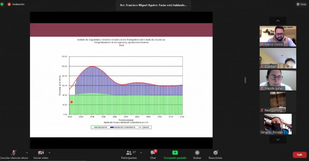 Zacatecas, Zac.- Después de seis días de reuniones virtuales encabezadas por el actuario Francisco Miguel Aguirre Farías, del despacho Valuaciones Actuariales del Norte, directivos del Instituto de Seguridad y Servicios Sociales de los Trabajadores del Estado de Zacatecas (ISSSTEZAC) y la base trabajadora cotizante, se presentaron los resultados del estudio actuarial al 31 de diciembre de 2019 y se propusieron alternativas de saneamiento financiero al instituto de pensiones.