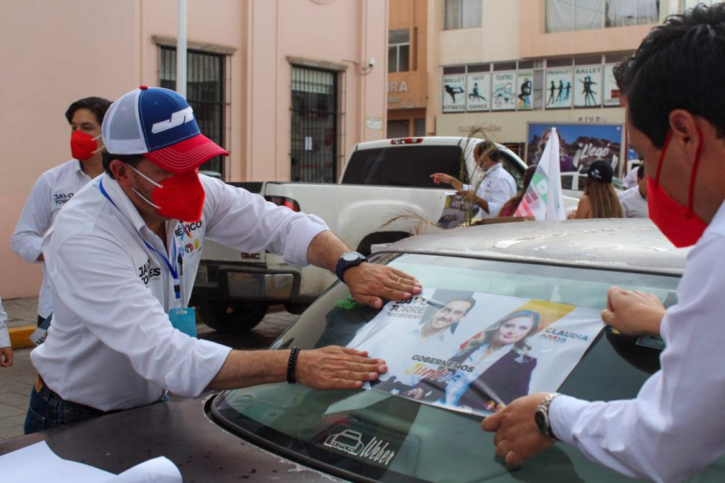 Fresnillo, Zac.- Después de realizar una caravana vehicular por las diferentes calles del centro de Fresnillo, los candidatos de la coalición Va Por Zacatecas, se reunieron para hacer una pega de calcas en la intersección de la Avenida Hidalgo y Avenida García Salinas.