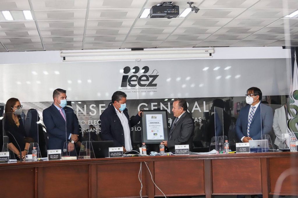 En sesión especial del Consejo General del Instituto Electoral del Estado de Zacatecas (IEEZ), el consejero presidente, Virgilio Rivera Delgadillo, entregó a Monreal Ávila la constancia que lo acredita como ganador del proceso electoral y celebró que la participación de la ciudadanía en la reciente jornada rebasó el 57 por ciento.