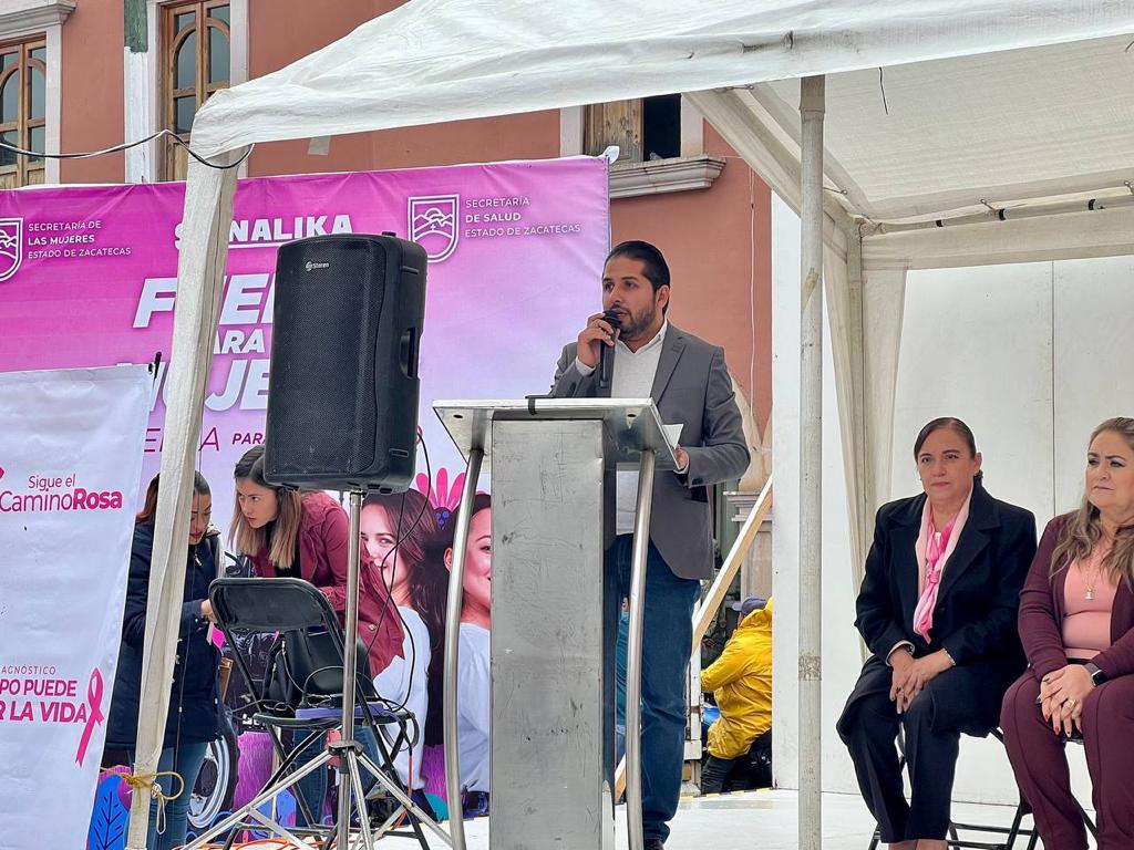 Martín Álvarez Casio, secretario del Ayuntamiento, en representación del alcalde de Fresnillo, Saúl Monreal Ávila, señaló que el municipio se suma a los esfuerzos de prevenir esta enfermedad que es el tipo de cáncer más común en el mundo, ya que se estima que al menos una de cada 12 mujeres padecerá de este mal a lo largo de su vida.