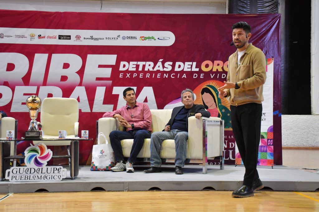 En el marco de la Feria Estatal de la Virgen de Guadalupe 2022, este día el exfutbolista Oribe Peralta llevó a cabo ante cientos de jóvenes su ponencia denominada ‘Detrás del Oro, Experiencia de Vida’ en el Auditorio de la Presidencia Municipal de Guadalupe, donde lo recibió el Presidente Municipal, Julio César Chávez Padilla, quien le agradeció que compartiera su experiencia con la juventud guadalupense para inspirarlos a prepararse y ser determinados.