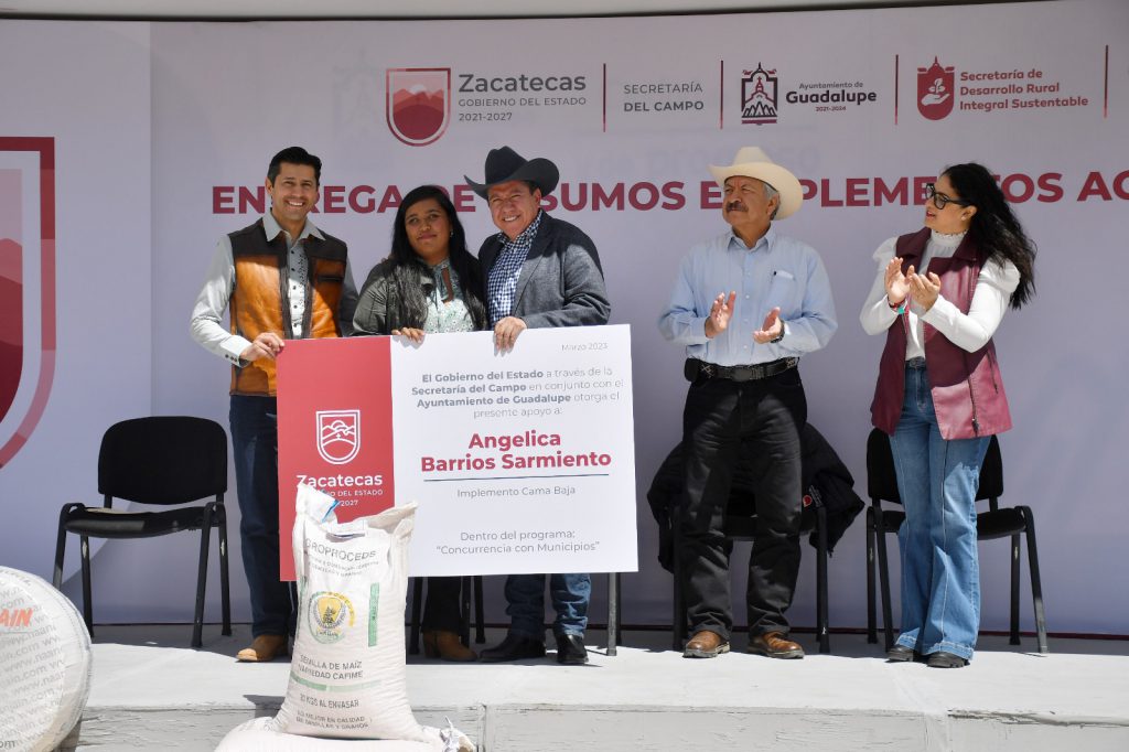 Con una inversión de 8 millones de pesos, monto ejecutado peso a peso a través del Programa de Concurrencia con Municipios, un total de 210 agricultores de 28 comunidades del Municipio de Guadalupe, se vieron beneficiados con la entrega de implementos agrícolas como tubería de conducción, cintilla, acolchado, fertilizantes, semillas, llantas para tractor, trailas, trilladoras, cajas apícolas, maquinaria apícola y ordeñadoras automáticas, entre otro más.