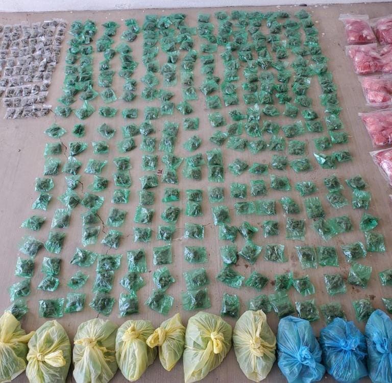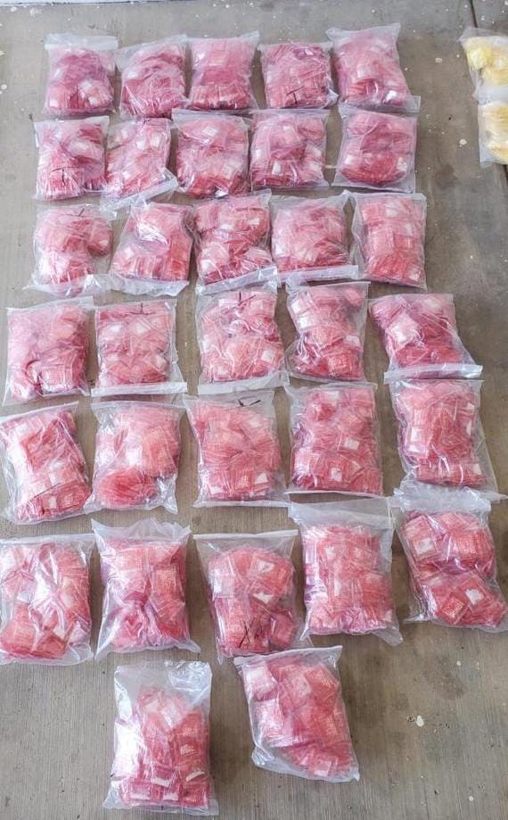 Asimismo, les decomisaron 31 bolsas de plástico con un total de 6 mil 200 dosis de una sustancia cristalina con las características de la metanfetamina y una bolsa plástica que contenía 233 pastillas de psicotrópico clobenzorex, arrojando, en total, 7 mil 718 dosis de diversas sustancias probablemente ilícitas.