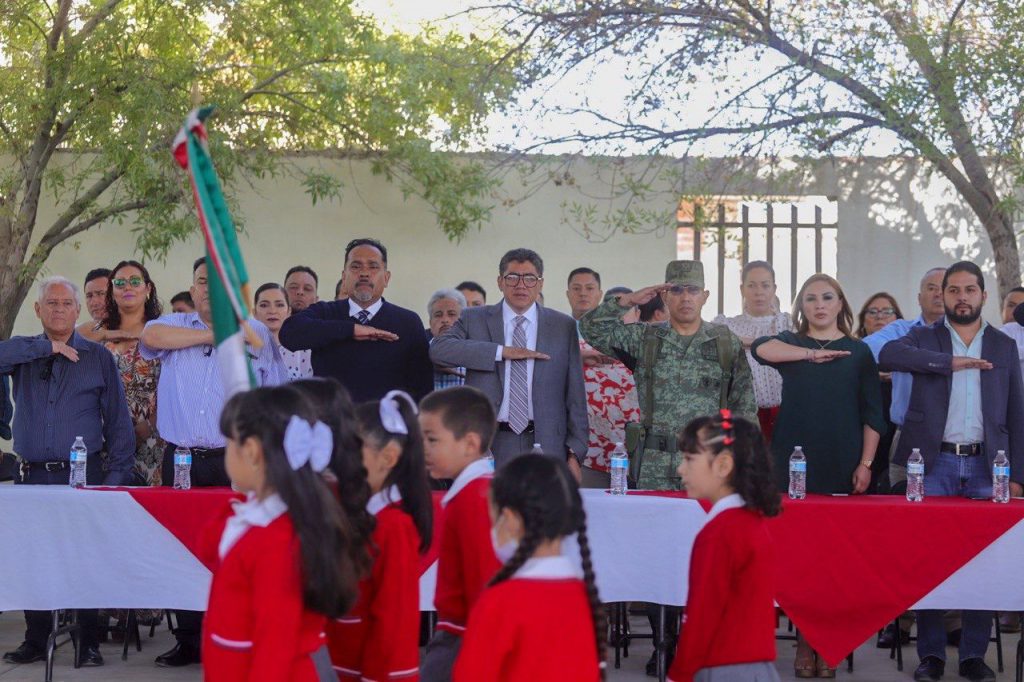 Fresnillo, Zac.- Alumnos y docentes del jardín de niños Augusto Isunza Escoto, en la colonia Arboledas, recibieron al alcalde Saúl Monreal Ávila, así como a los regidores y funcionarios municipales, para la celebración de los tradicionales Honores a la Bandera, con los que se busca fomentar en los pequeños los valores cívicos.