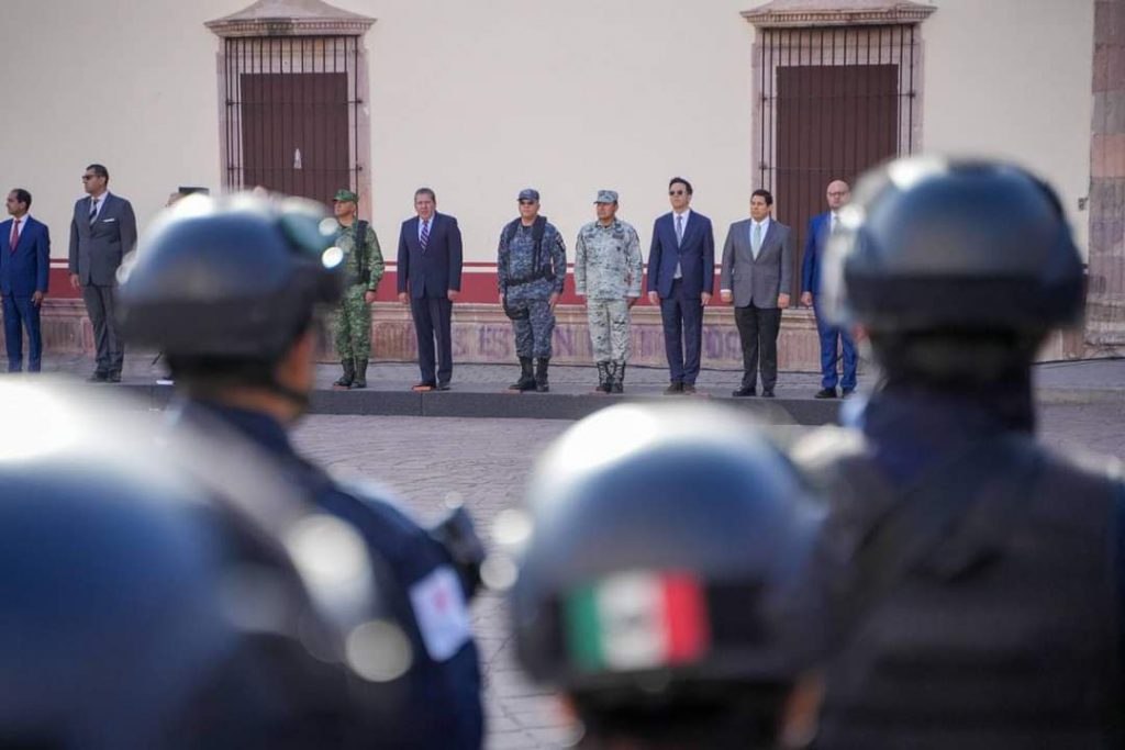El alcalde de la Capital, Jorge Miranda Castro, acompañó al gobernador, David Monreal Ávila, en la entrega de equipo a elementos de la Policía Estatal Preventiva que se realizó durante la ceremonia de Honores a la Bandera.