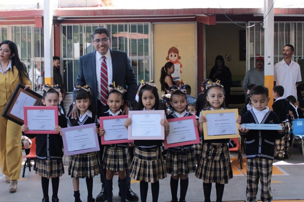 Guadalupe Ovalle Gallardo, directora de la institución, entregó al presidente municipal un reconocimiento por su loable labor, al mostrar a los pequeños el valor cívico, y por comprometerse con la educación.