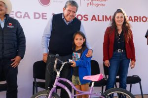 Luego de escuchar a las y los productores de estas comunidades del norte del estado, el Gobernador David Monreal Ávila hizo entrega de bolos y bicicletas a las niñas, niños y adolescentes, así como cobijas a los adultos mayores, para que tengan con que enfrentar este invierno.