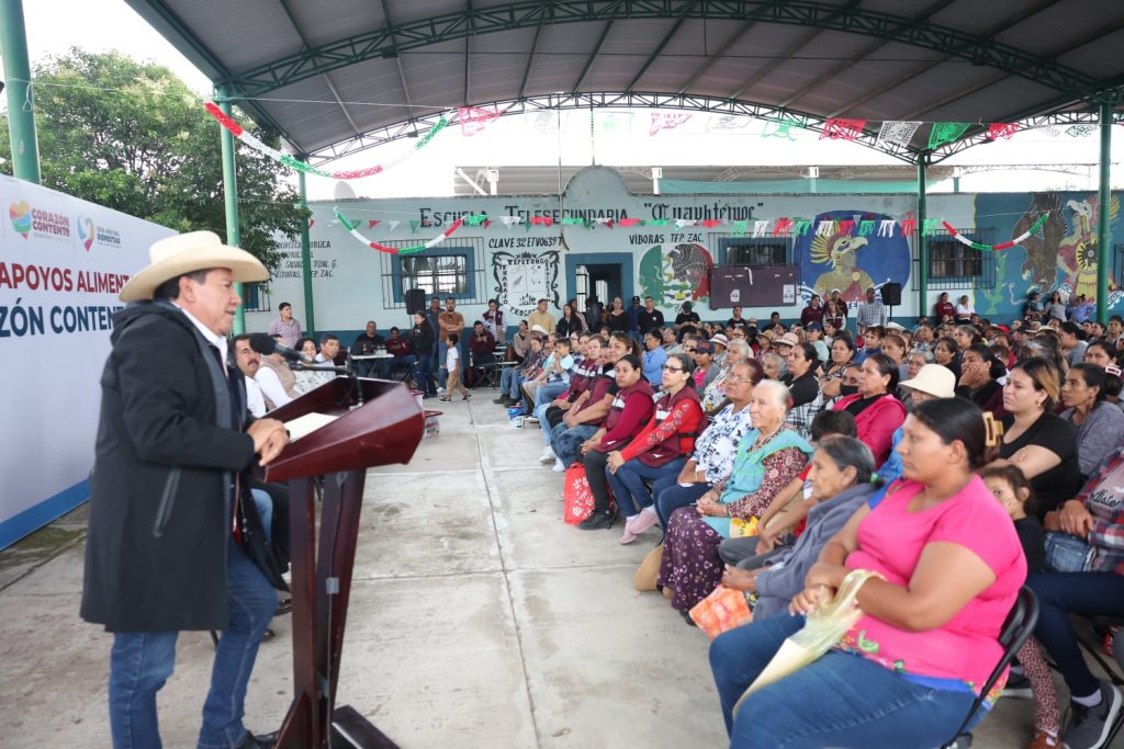 En la comunidad de Víboras, el mandatario estatal entregó apoyos alimentarios a los habitantes, así como a los pobladores de las localidades Emiliano Zapata y El Cacalote; reconoció la participación activa de la ciudadanía, principalmente de las mujeres, quienes “cumplen de manera diligente, responsable, tienen muy limpias sus comunidades, las tienen cuidadas, porque ese es parte del propósito de Corazón Contento”.