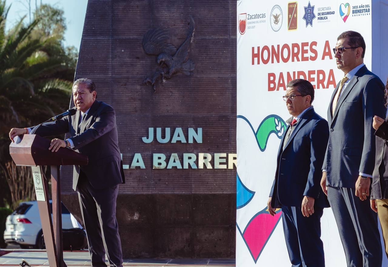 • En los Honores a la Bandera, el mandatario destacó la labor de los integrantes de la Mesa de Construcción de Paz, que ha llevado a que Zacatecas sea uno de los estados más seguros del país